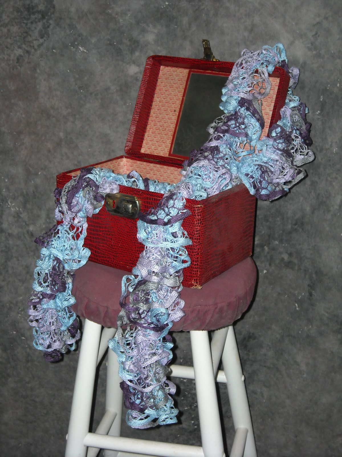 As you can see, it's another Frilly Crochet Scarf, but made with Premier Yarn's Starbella "Eventide".
